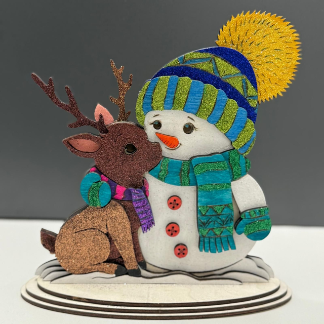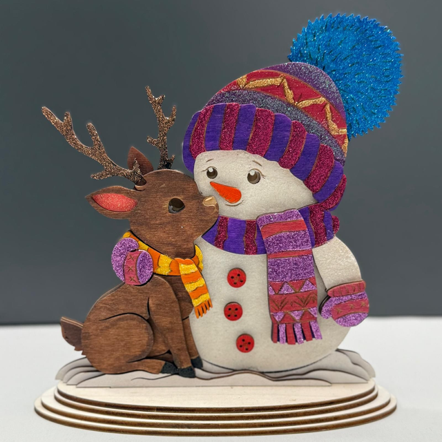 Diese bezaubernde Winter-Dekofigur zeigt einen fröhlichen Schneemann, der liebevoll mit einem kleinen Rentier kuschelt – ein herzergreifendes Motiv, das sofort winterliche Stimmung und Wärme verbreitet. Die Figur besteht aus hochwertig gelasertem Holz und wurde aufwendig von Hand bemalt und mit glitzernden Effekten veredelt.