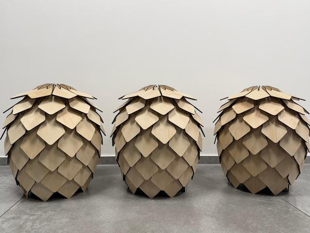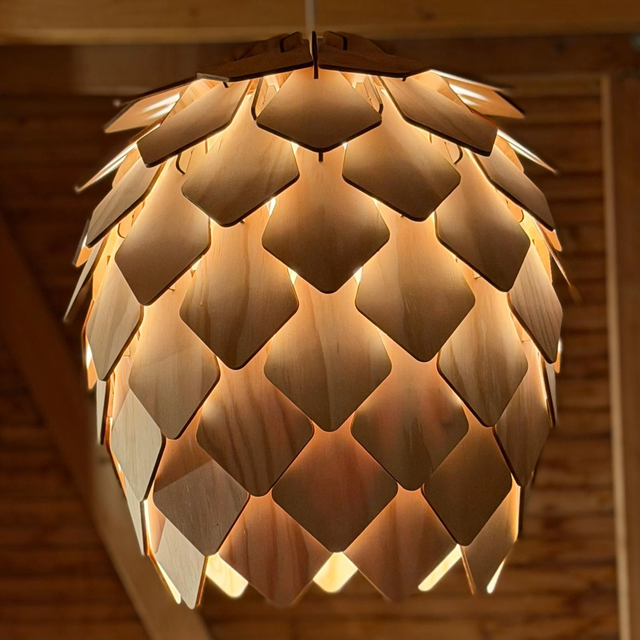 Diese stilvolle Hängelampe aus 4 mm starkem Kiefer-Sperrholz verbindet natürliche Materialien mit einer modernen, organischen Form. Die schuppenartig angeordneten Holzelemente verleihen der Lampe ihre außergewöhnliche Optik und sorgen für ein faszinierendes Licht- und Schattenspiel im Raum.